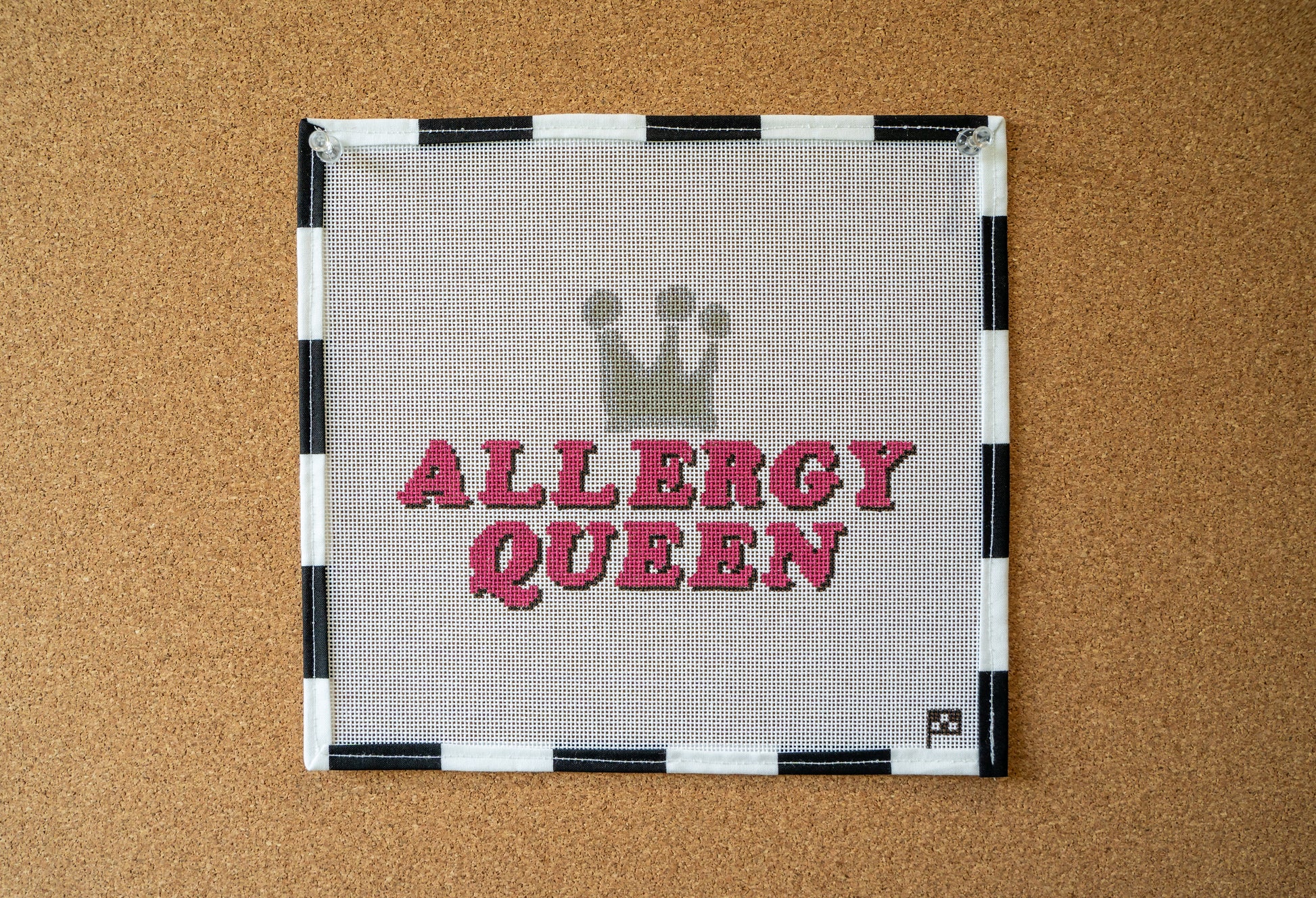 Not all heroes wear capes—some just carry tissues, arsenal of allergy meds, and Epi-Pens. Allergy Queen proudly wears her crown (literally), celebrating the everyday battles with sneezes, sensitivities, and snack substitutions. This cheeky canvas is perfect for anyone who rules their allergy kingdom with humor and grace. A fun stitch for yourself or the reigning monarch in your life. 👑